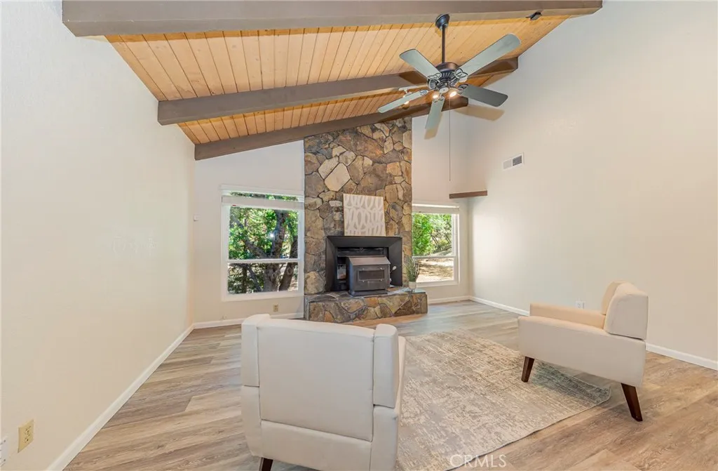 Drive through a country feel setting neighborhood with cows and horses. At the property there is a gentle upslope driveway offering views of mountain peaks, beautiful sunsets and occasional mountain deer. This single level home is turnkey, move in ready for you to bring your landscaping ideas and your creative touches. Walk into a living room with a Rustic Design inspired high wood beam ceiling. This home offers a large primary bedroom with a full bathroom, two good size guest bedrooms and a full bathroom in the hall. Newer flooring though-out, newer dual pane windows through-out, roof age 2011, granite counters in kitchen and bathrooms, central heating and air conditioning, newer kitchen appliances, neutral paint inside and out, two covered porches, front and back for your porch sitting. Attached two car garage on ground level with plenty of storage space. A recorded easement and map of survey that benefits this property to drive around back to park your boat or camping trailer on the property. Surveyor flagged. Possibilities to expand the back yard for a shop. Great for Short Term Rental, No HOA and water from Pikes Ranch mutual water company. One year Buyer's home warranty included, cost limit applies. Nothing is wrong the with house or location. A must see!