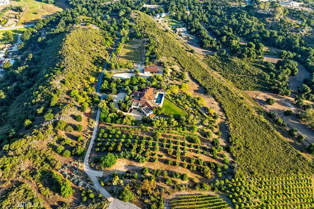 Welcome to HARMONY RANCH A SANCTUARYAND CROWN JEWEL OF THE SANTA ROSA PLATEAU! Masterpieces with these amenities are not only unique in this marketplace, but only rarely come to market. To build this exquisite estate again would require years in the creative process, lengthy custom construction, expansive usable land with panoramic views, and would cost millions over this asking price! Lived in very gently since its inception, it is available now to the most discriminating buyers. THIS IS A LIFESTYLE!From the moment you enter the security gate, the ambiance of 28+ private acres envelopes you, leading you on a peaceful journey past mature landscaping, equestrian pastures, a custom expandable 4-stall barn, half bath, chicken coop with AC & lighted arena to the exquisite 5-BD single-story Mediterranean home, flanked by mature olive trees and adorned with an authentic courtyard with Spanish-tiled fireplace, fountain & covered seating. Drive further to find a charming vineyard, prolific & diverse orchard & second access gate. Step inside the luxurious estate to find upscale details throughout, including high-end flooring, quality custom windows & doors, top-of-the-line appliances, Taj Majal Quartzite counters, designer fixtures, beamed ceilings, recently installed wifi indoor/outdoor sound system, wifi thermostats & security, 2 primary suites each with exterior access and one with a fireplace, soaking tub with view, steam shower & additional outdoor half bathroom/shower. The 2 garages with fresh epoxy flooring provide room for 5 cars, plus workspaces. Entertain in the stylish