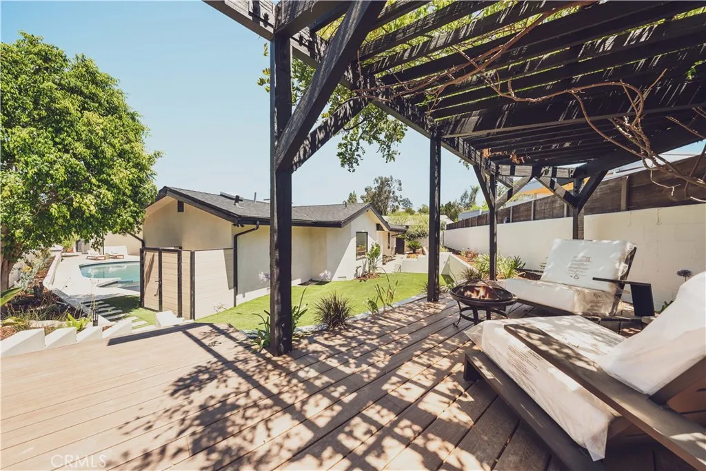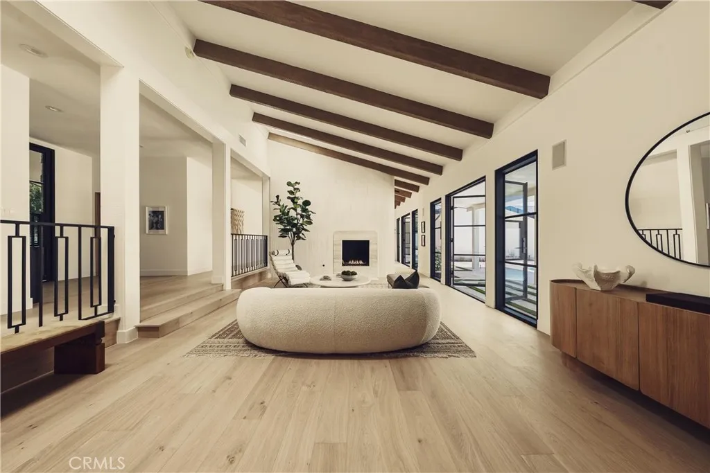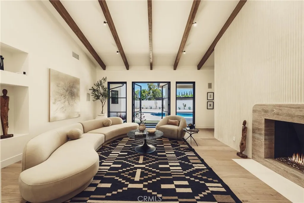 Welcome to this stunning, sprawling residence in the Hills of Encino, offering timeless, luxurious design and exceptional craftsmanship. From the moment you arrive, the smooth stucco faade with limestone accents delivers striking curb appeal. Travertine steps lead you to an impressive ten-foot glass entry door, setting the tone for what awaits inside. The foyer is bathed in natural light, thanks to multiple iron French doors and strategically placed skylights. The great room is anchored by an expansive fluted architectural fireplace, creating a sophisticated, inviting ambiance. Throughout the home, premium finishes, including French oak engineered hardwood flooring. A massive living room faces the backyard seamlessly flows into the chefs kitchen, highlighted by a large island with fluted wood paneling, abundant white oak cabinetry, top-of-the-line Thermador appliances, and a walk-in pantry for added convenience. Adjacent to the kitchen, a private family room offers a cozy retreat separate from the main entertaining areas. A central hallway leads to two bedrooms, a formal dining room featuring a built-in wine rack, a stylish bathroom, and a utility room with laundry facilities. In the southern wing, youll find two en-suite bedrooms and the expansive primary suite overlooking the backyard. The primary bathroom is a showstopper, with dual showers featuring travertine checkered floors, limestone flooring, and a custom dual vanity topped with Arabescato Corchia marble. The custom walk-in closet provides generous storage and organization. The low-maintenance backyard is perfect f