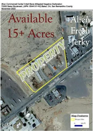 This Baker Blvd 5 Acres has a Condition Use Permit and plans to build a 20-pump fueling station, 20,400 sq ft convenience store, 3,864 sq ft coffee shop with a drive through, street improvements with two access points. It has approximately 500 feet frontage along Baker Blvd. Baker Blvd 5 Acres is strategically located on Baker Blvd, maximizing visibility of passing freeway traffic, on the I-15 corridor, the critical artery connecting Los Angeles and Las Vegas and high-volume traffic requiring a break before or after the long desert crossing. Its location ensures a constant stream of travelers, it is one of the busiest travel routes in the Southwest. This retail location will be another roadside encounter, like the Alien Fresh Jerky, World's Tallest Thermometer and Mad Greek. Baker Blvd 5 Acres is located next to the Iconic Alien Fresh Jerky and UFO Hotel, highly visible landmark. The store's unique, massive alien theme architecture is designed to resemble a huge alien space vehicle and soon to be an Alien Spaceship Hotel, visible directly from the 15 Frwy. A financially successful and well-established Tourist Roadside Attraction & High-Volume Retail Site, globally recognized, high-traffic commercial property and established brand strategically located on Baker Blvd. This is one of the best Locations along the 15 Freeway. The potential visitors the Baker Blvd 5 Acres can pull in from being located next to the Alien Fresh Jerky is unlimited. Baker Blvd 5 Acres is located next to the Mad Greek Cafe. The Mad Greek is located on the busiest corner of Baker Blvd and Highway 127.