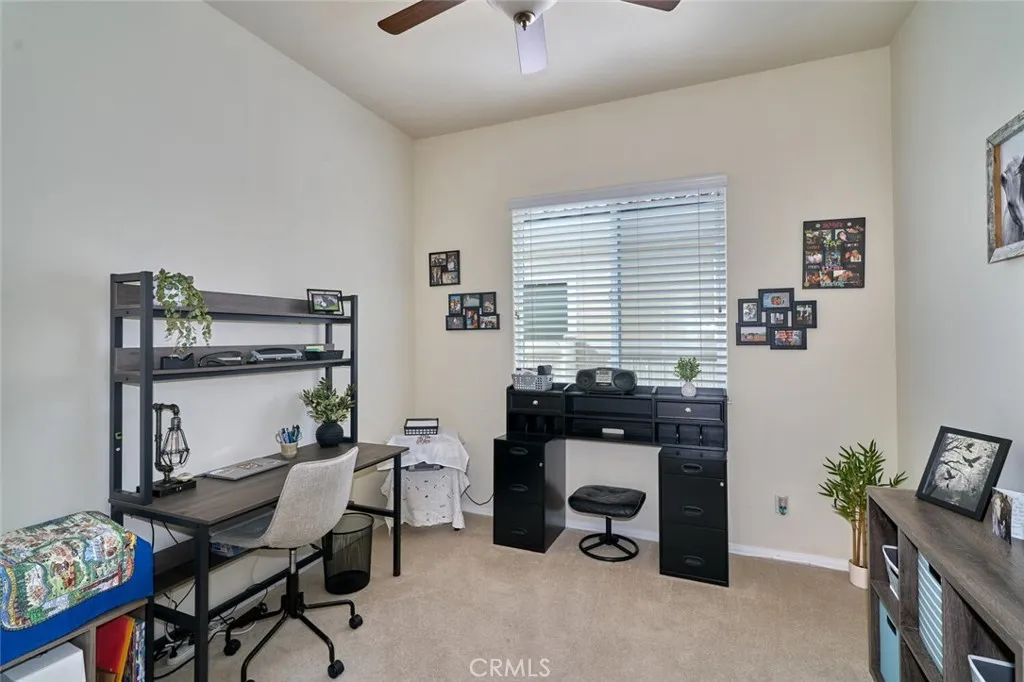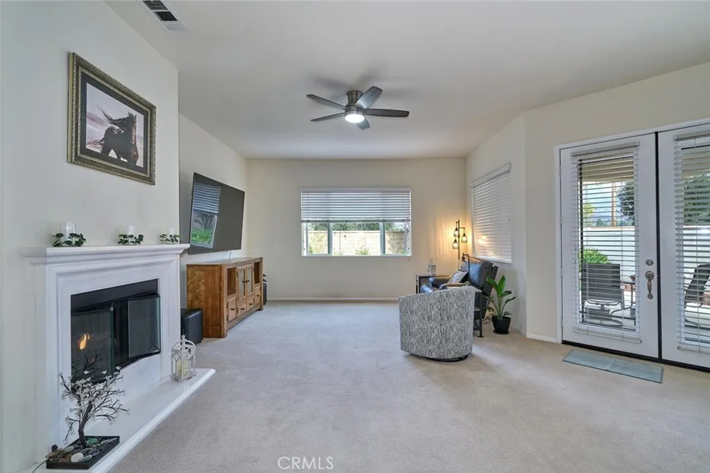 Popular Emerald model in Solera, a gated 55+ community, with mountain views and no rear neighbors. Nicely landscaped front and back yards. Solar with a low $91 monthly payment and a newer water softener system. The home features a gas fireplace in the living room, two and a half baths, and two bedrooms plus a versatile third den or office. Large walk-in closets in the bedrooms. The primary suite includes a walk-in shower and jetted bathtub. A front security screen door and screened back door allow for natural airflow. Ceiling fans throughout. Pendant lighting in the kitchen. The garage includes a dedicated golf cart space or just additional storage. All appliances are included. Solera amenities include a pool, spa, clubhouse, indoor gym and walking track, tennis courts, billiards, bocce ball, library, classes, clubs, group trips, and 24-hour security. Basic Spectrum cable and internet are included with the HOA. Convenient access to Palm Springs, Redlands, Oak Glen, Cabazon Outlets, Morongo Casino, golf courses, and nearby freeway access.