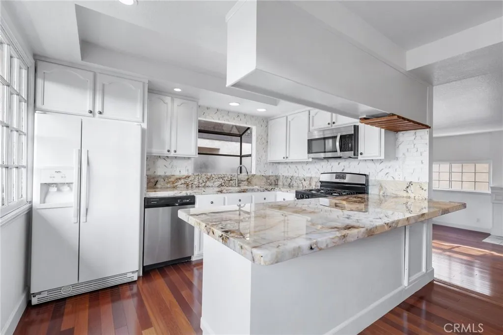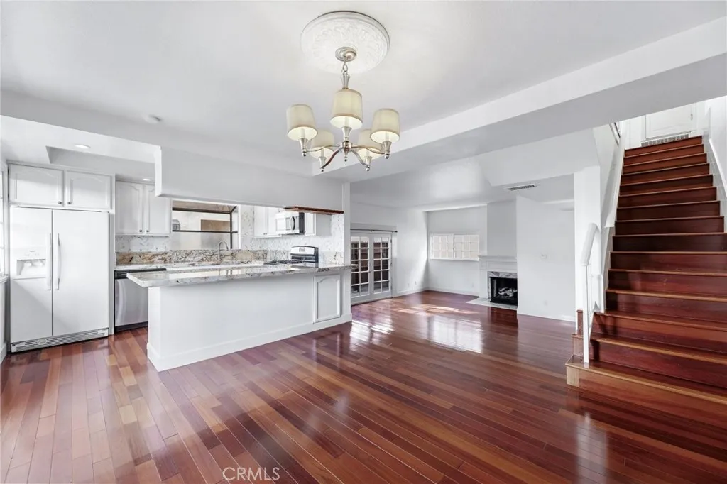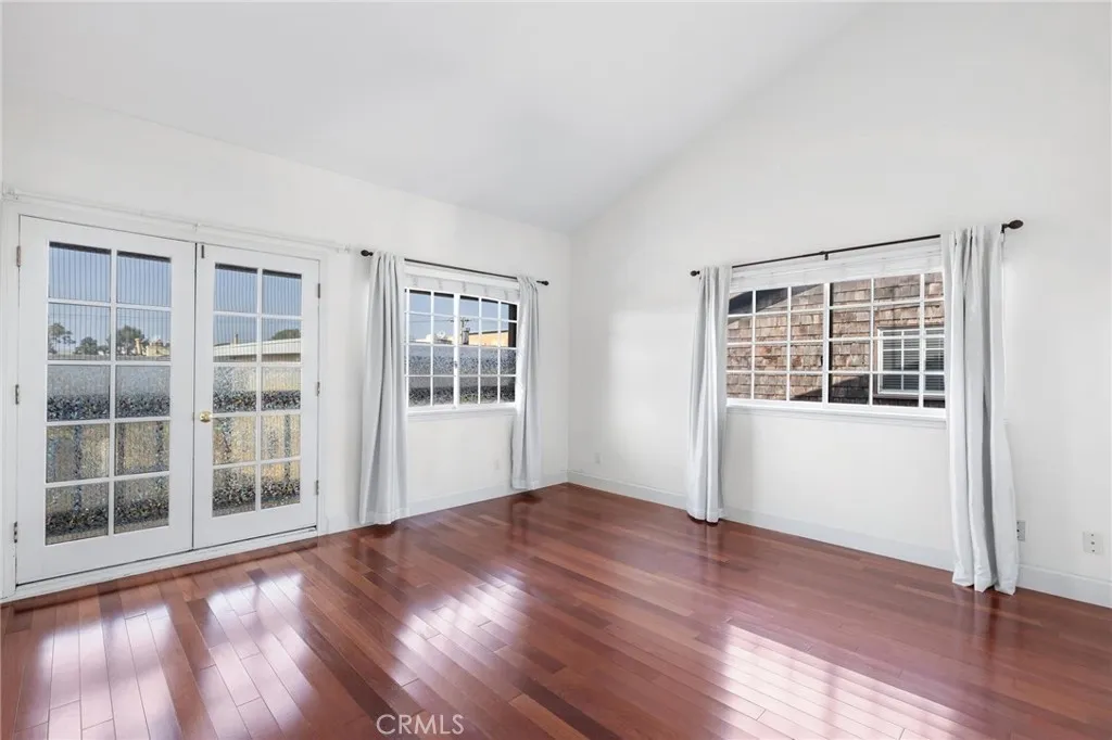 Quietly situated as a rear-unit townhome, 1515 Artesia Blvd Unit #2 is a charming retreat. Upon entry, the home is bathed in natural light and features hardwood floors throughout. The living room includes a fireplace and French doors that open to a private outdoor patio, creating indoor-outdoor flow. Just two steps up, the dining area features a second set of French doors leading to a private terrace and connecting to the adjacent kitchen, which offers ample storage and breakfast bar seating. A powder room and direct access to the two-car garage complete the main level. Upstairs, both bedrooms feature en-suite bathrooms. The primary suite offers vaulted ceilings, a private outdoor terrace, generous natural light, a large walk-in closet, and an en-suite bathroom with a glass-enclosed shower. The secondary bedroom features high ceilings, an en-suite bathroom, and ample storage. An upstairs laundry room with built-in storage and a skylight providing additional natural light completes the upper level. With easy access to downtown Manhattan Beach shops and dining, as well as LAX and major freeways just minutes away, 1515 Artesia Blvd Unit #2 presents convenience, charm, and everyday livability.