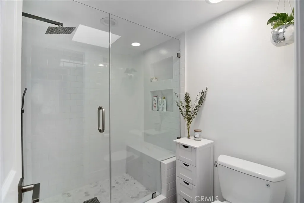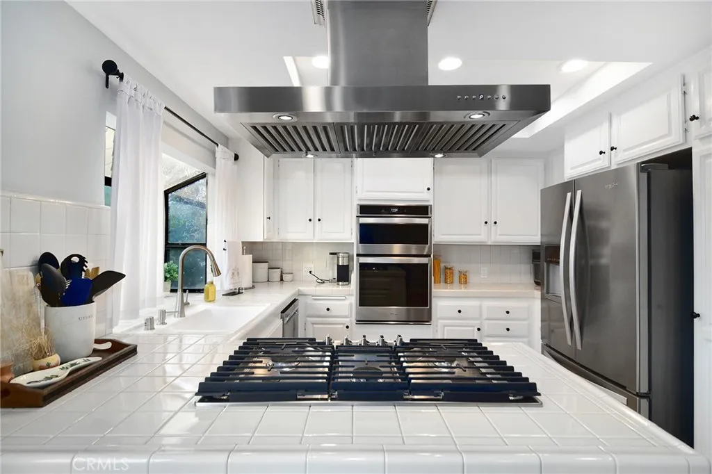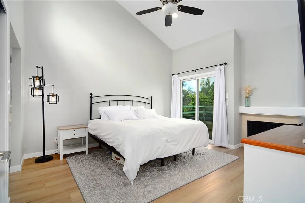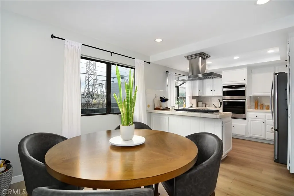 Resort style living in a stunning tri-level Tarzana townhome. Tarzana Courts, a gated and highly sought-after community, offers the perfect combination of privacy, security and comfort. Nestled in a serene, park-like setting with lush landscaping and cozy park benches, this beautifully appointed 2 bedroom + 2.5 bathroom townhome has all the space and features you need for modern living. Situated at the very back of the complex, this CORNER UNIT with only one shared wall offers the added convenience of not only being light and bright, but also extremely private and quiet. The home opens to a large private patio, ideal for relaxing weekends or evening gatherings. Inside, the living room welcomes you with high ceilings, a cozy gas fireplace, recessed LED lighting and newly installed luxury vinyl wide plank white oak flooring that runs throughout the home's interior, enhancing its warmth and elegance. Up a level, you'll find a spacious formal dining room with adjacent wet bar and half bathroom. The kitchen features timeless subway tile counters, updated stainless steel appliances, plentiful cabinet space, all of which opens to a stunning breakfast nook or versatile den/family room. Upstairs, the spacious primary suite is a true retreat, with loads of new double pane windows, dramatic soaring ceilings with recessed LED lighting, a romantic skylight & gas fireplace as well as a private balcony overlooking the community greenbelt. In addition, it offers a very large attached sitting area/office/gym....you decide! Dual closets, one of which is a large walk-in, as well as an en-suit
