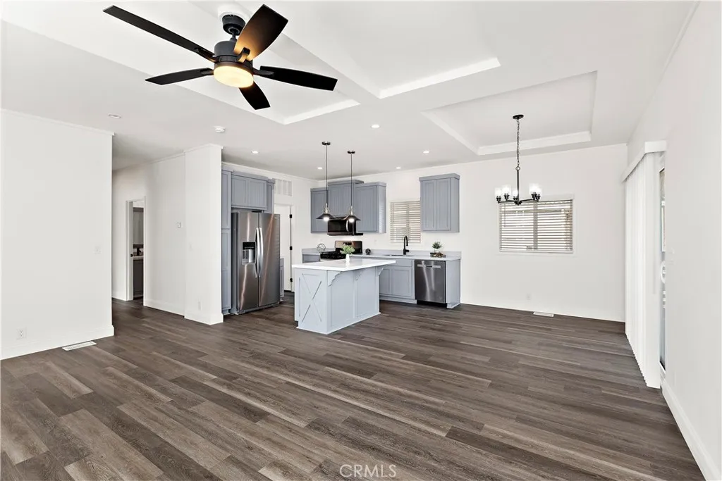This charming single-family property in La Verne offers picturesque mountain views and a range of amenities within the Kingsway Gardens community. Built in October 2023, this modern manufactured home boasts an inviting open floor plan with 3 bedrooms / 2 bathrooms and a den that could also serve as a 4th bedroom, home office, or kid's playroom. This park is located near the fairgrounds, which offers a variety of venues and family fun. Comes with stainless steel appliances, including a refrigerator with an ice maker. This open-concept layout includes central air and heat, ceiling fans, a quartz countertop, hardwood cabinets, and a 2-3 vehicle carport. There is a utility/laundry room. This home is bright and has natural light throughout the interior spaces. The house is designed for social gatherings, featuring an oversize front patio that seamlessly connects to the main living areas. Residents can enjoy the community, swimming pool & two spas, along with a playground. There is also an outside laundry room and an event clubhouse for your social gatherings. This dream home is conveniently located near shops, restaurants, and easy access to freeways. This is in the La Verne school district, which is known for its above-average educational experience.