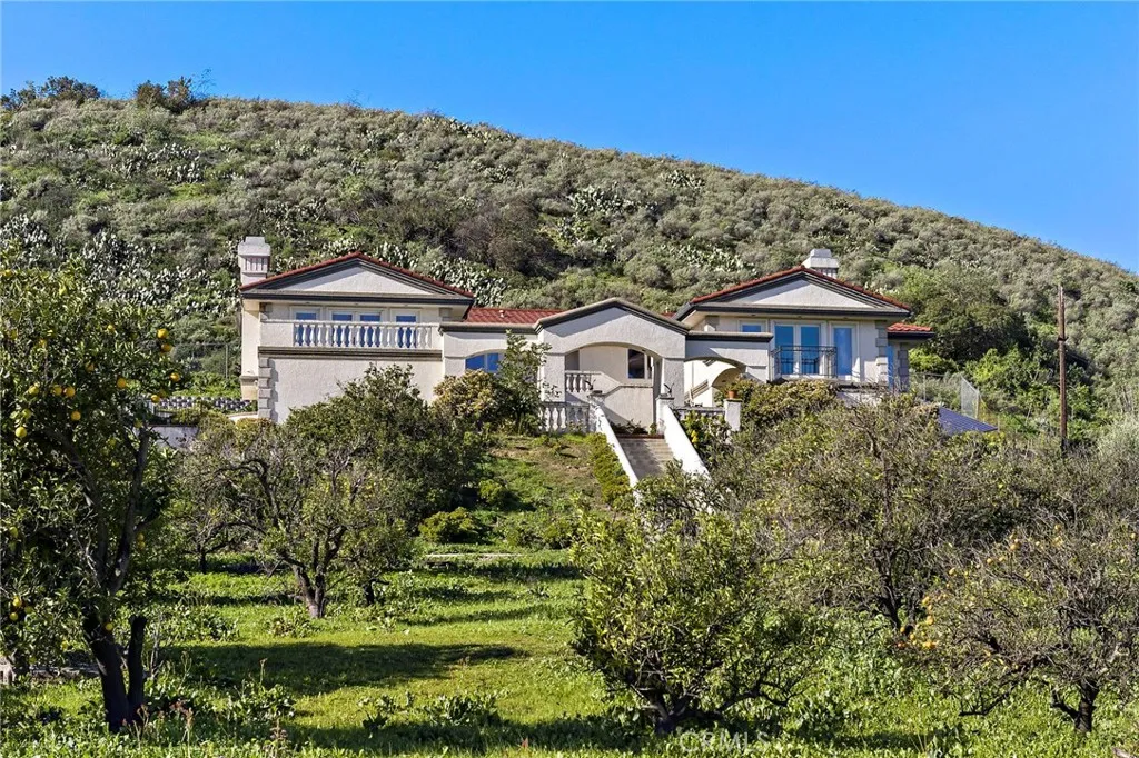 Situated in a secluded rural enclave of the unincorporated Orange Park Acres community, this exceptional one-acre estate at 11031 Meads Ave combines privacy, panoramic views, and flexible living spaces. Perched above mature groves of orange, apple, olive, and fig trees, this 6-bed, 5-bath, ~5,168 sq ft residence is accessed via a long private driveway and gated entry. Sunrise views of the hills and mountains are enjoyed from the family room, balconies, kitchen, and primary suite. The kitchen is beautifully updated with Carrara marble countertops, custom cabinetry, and high-end Viking appliances including a built-in fridge. The lower level includes a self-contained in-law suite with its own kitchen, living, and dining areas, plus separate access ideal for multi-generational living or potential rental. Outdoors, a Fire Magic Echelon Diamond built-in barbecue, a large deck, and expansive views create an entertainers paradise. Upgrades include a Class A fire-rated steel roof with transferable warranty, a fully paid ground-mounted solar system, a 3-car garage with insulated doors , and high performance Andersen doors and windows throughout.