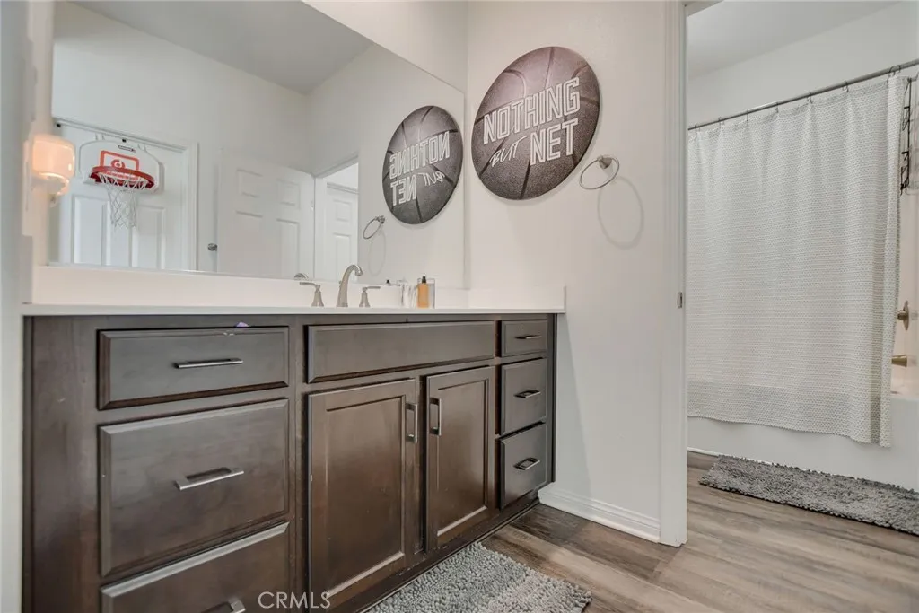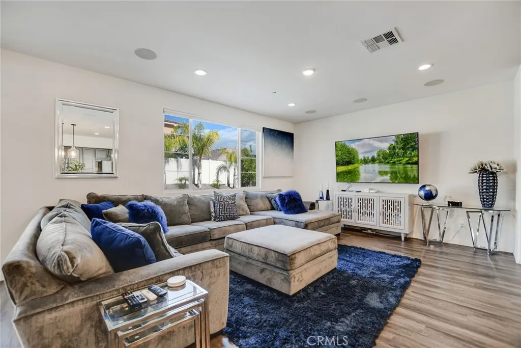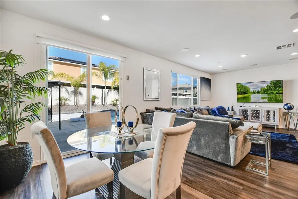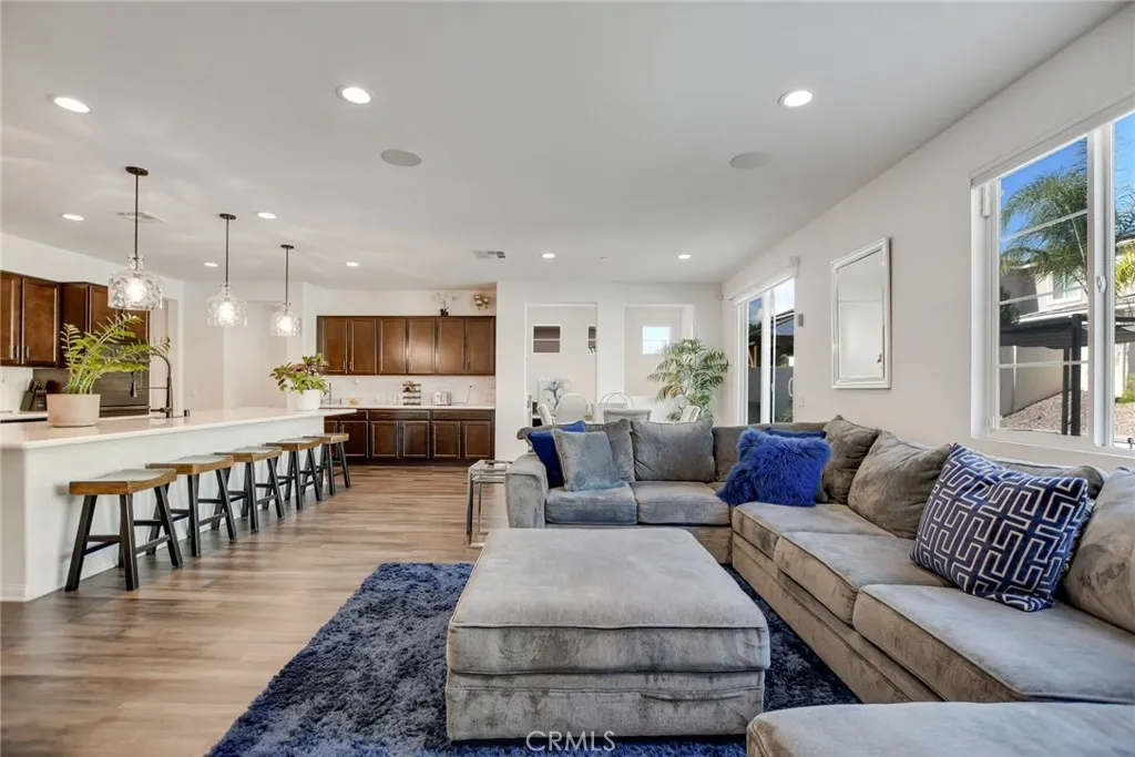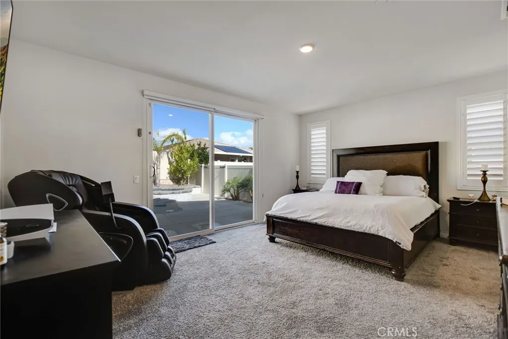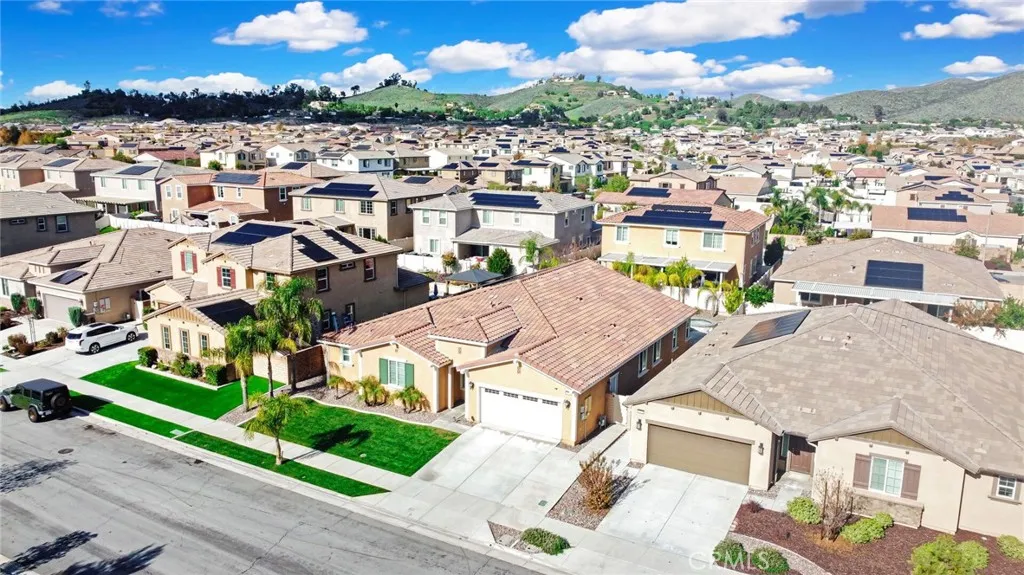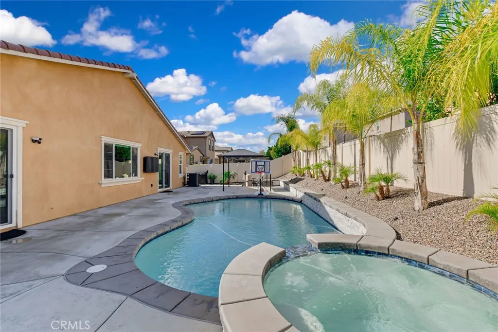 SINGLE STORY SALTWATER POOL HOME located in the desirable Audie Murphy Ranch community of Menifee, built in 2021 by Richmond American Homes featuring the Julia floor plan with an open and functional layout and modern finishes throughout, including a fourth bedroom option in place of a tandem garage. The exterior offers mature landscaping and a private backyard with an in-ground saltwater pool and spa, vinyl fencing, and space for outdoor use. Private backyard includes a freestanding pergola creating a shaded outdoor seating space. Interior highlights include luxury vinyl plank flooring in the main living areas, carpeted bedrooms, abundant natural light, upgraded lighting, window shutters in the bedrooms, shades in the main living area, and an open great room with ceiling speakers. The kitchen features a quartz extended island, GE Profile black stainless steel appliances, double oven, large pantry, and ample cabinetry. The primary suite includes an ensuite bathroom with soaking tub and custom shower, while three additional bedrooms provide flexible living space. Additional features include a tankless water heater, 24 leased solar panels, and a two-car garage with automatic door openers. Community amenities include pools and spas, tennis courts, walking and biking trails, parks, barbecue areas, clubhouse, and skate and sport parks, with convenient access to award-winning schools, shopping, medical facilities, and the 15 and 215 freeways.