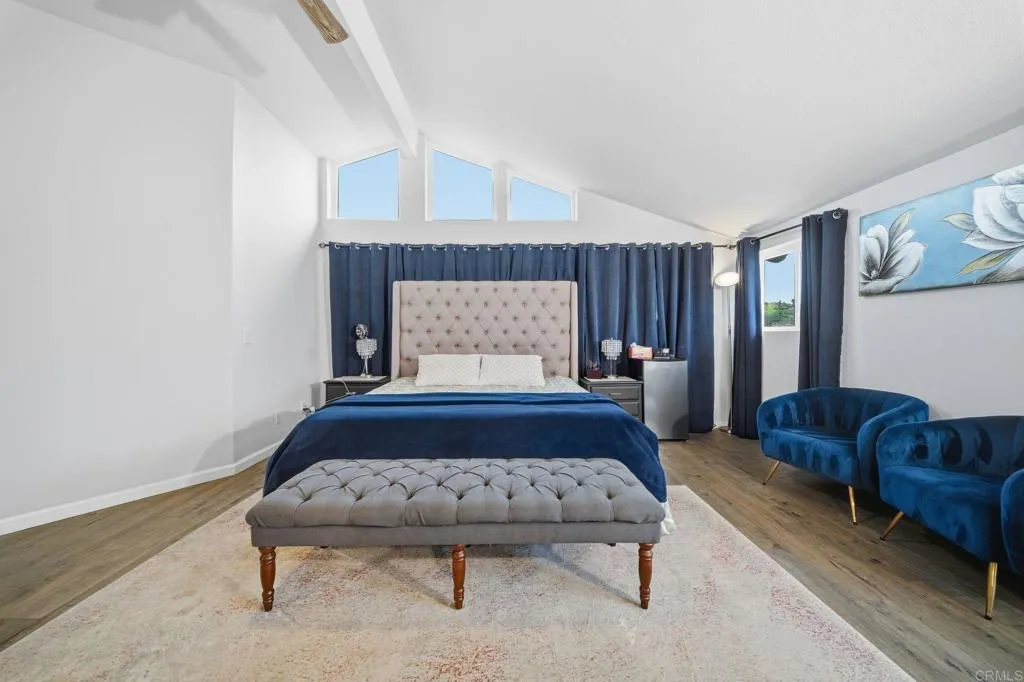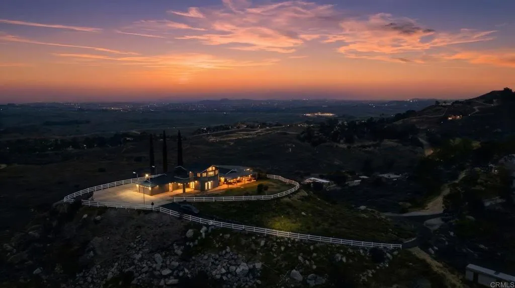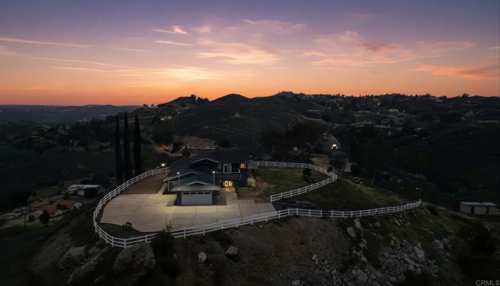 Perched atop approximately two private acres in the desirable Lake Mathews Estates, this stunning hilltop home offers breathtaking panoramic views of the lake, city lights, and surrounding mountains paired with exceptional privacy, usable land, and thoughtful upgrades throughout. This spacious 6 bedroom, 4 bath residence is ideal for large or multi-generational living, featuring dual primary suites located on separate levels, each with their own renovated private bathroom. The upstairs primary retreat enjoys direct access to a private balcony, perfectly positioned to take in sweeping lake and city views. At the heart of the home is a centralized, open kitchen designed for both everyday living and entertaining, offering generous butcher block counter space, a custom storage island, and a large utility style sink. The kitchen flows seamlessly into the dining area with original brick fireplace, breakfast nook, family bonus room, and an oversized living room framed by picture windows capturing the surrounding scenery. The interior showcases solid surface flooring throughout, including herringbone patterned tile and wood style laminate. Additional highlights include split ac units servicing individual rooms, mounted televisions, a dedicated laundry room/ pantry, and flexible sixth room currently used as an office that can easily convert to a bedroom or additional living space. Recent upgrades enhance both comfort and efficiency, including dual pane vinyl windows and sliders, updated HVAC, plumbing and electrical improvements, a composite roof, and a main septic system with an ad