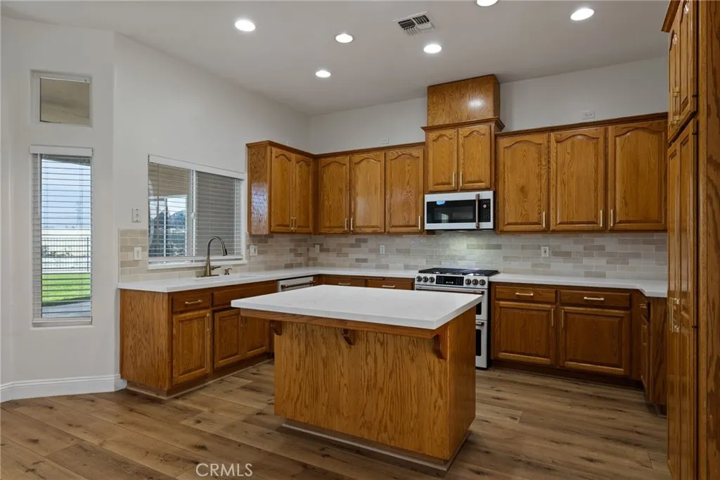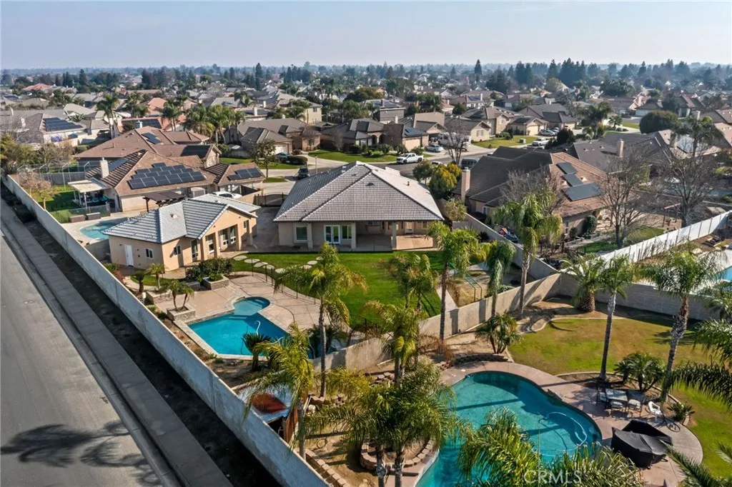 Welcome to this updated, custom-built home with back house located in the desirable Shilo Estates neighborhood of Northwest Bakersfield situated on an oversized cul-de-sac lot. The main residence, which has 3 bedrooms plus an office, has been recently refreshed with new luxury vinyl wood-look flooring, baseboards, carpet in the bedrooms, light fixtures, and complete interior pain. The updated kitchen features stunning quartz countertops and upgraded appliances, creating a bright and functional space perfect for everyday living and entertaining. Step outside to your private backyard retreat, complete with a fully fenced custom pool featuring cascading waterfalls, a large grassy area, designated gardening space, RV parking, and a full perimeter cylinder block wall for added privacy. The additional back unit adds flexibility and showcases wood-look flooring, fresh paint, new light fixtures, a kitchenette with bar counter, and an bath. This home is turn-key and ready for you to call home!
