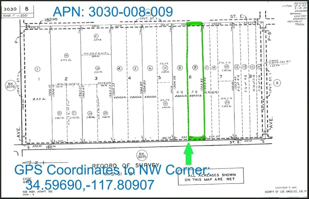 4.95 Acres (APN: 3030-008-009) GPS: 34.5969, -117.80908 According to the Los Angeles County the property [ ZONING ] A-1-2 Light Agriculture. Single family residences, crops, greenhouses, raising of cattle (horses, sheep, goats, poultry) are permitted uses in the area. [ POWER ] Overhead Powerlines run along 180th St E. (west property line) [ WATER ] Water is provided by the LA County WWD 40-35 district. Residents in the area have septic tanks for their sewer needs, no septic installed. [ PAVED ROAD FRONTAGE ] Property fronts 180th St E which his PAVED, and also has rear access to the back of the property via 182 St E which is a dirt road. <