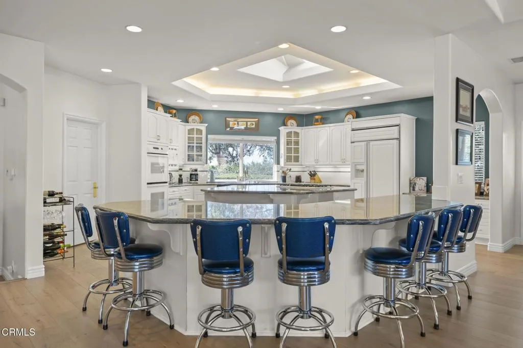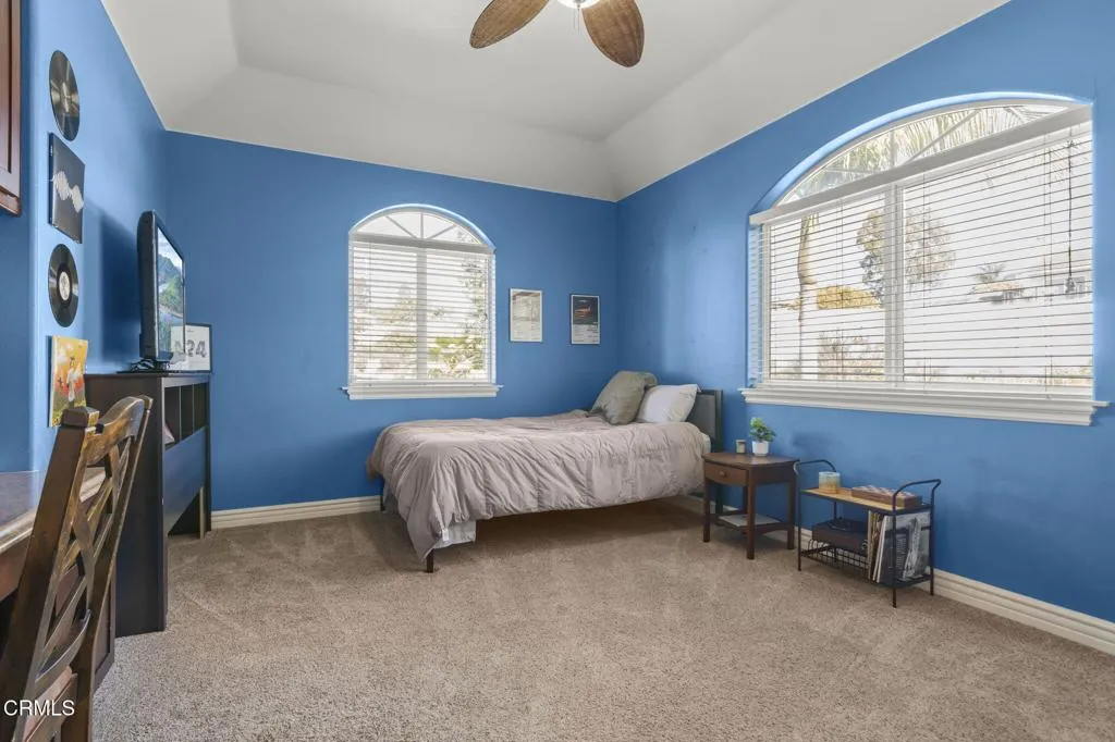 Beautiful large single story home located in the Terra Bella Estates in Camarillo, this spectacular property offers the best of both entertaining and private worlds. Situated high at the end of a small cul-de-sac, this 4,109 square foot home features 4 bedrooms and 4 bathrooms, including a plush primary suite with two walk-in closets. Extraordinary attention to detail in the design of this custom home includes vaulted and beveled ceilings throughout, arched entryways, and step-up living areas. The gourmet kitchen opens to a great room which boasts a marble adorned fireplace, an office nook, and ample natural lighting. The 1 acre lot features a custom freshwater pool and spa providing the perfect ambiance for entertaining. Two shaded pergolas as well as an outdoor Viking grill and refrigerator will persuade you to indulge in the lap of luxury. Owned solar panels. If you like cars, check out the 4 car garage.