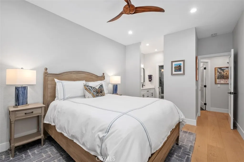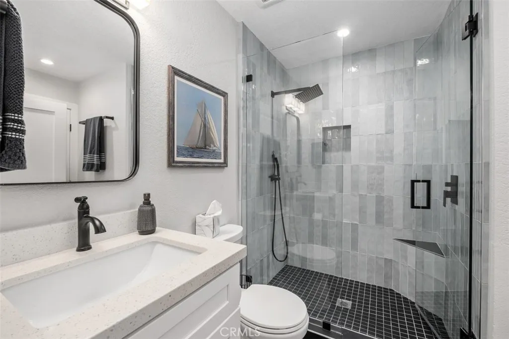 Prime Location! Recently completed top-to-bottom renovation! Fully furnished, turn-key, ground-floor, single-level located in a quiet, community walking distance to fine dining and two shopping centers, coastal close with a refreshing ocean breeze. Community pool and spa. This open-concept home features newly replaced hardwood floors, updated interior/exterior doors and beautiful custom windows, recessed lighting throughout, and a two-way gas fireplace with bi-fold glass doors. Modern kitchen includes quartz countertops, custom cabinetry, bar seating, and recently updated appliances: 6-burner range, dishwasher, disposal, microwave, refrigerator, and interior stacked washer/dryer. Spacious primary suite offers a professionally designed custom closet. Bathroom features dual sinks plus a separate privacy room with vanity and step-in shower. Additional highlights include updated heating and central air systems, remote-controlled bedroom ceiling fan, and top-down/bottom-up remote shades in dining area with additional shutters, shades, and draperies throughout. Covered patio with room for BBQ and outdoor diningenjoy morning sun without harsh afternoon exposure. Attached garage with epoxy flooring and EV charger. Move-in ready and thoughtfully upgraded throughout!