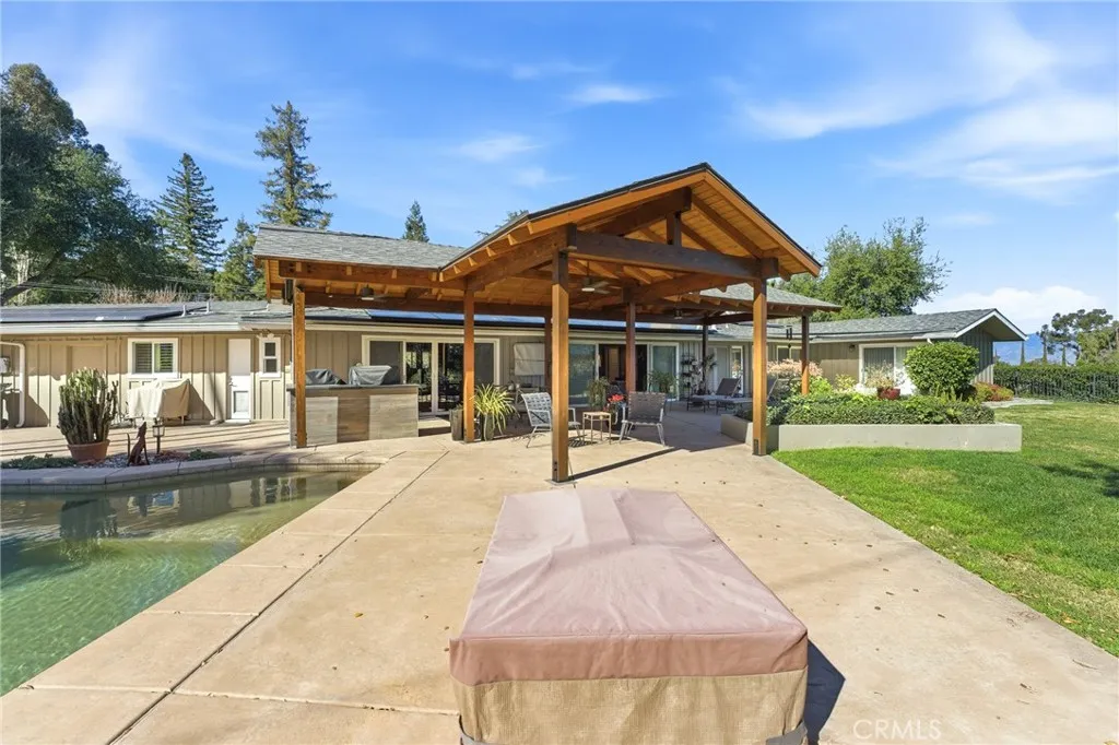 Embrace this Rare Opportunity! Imagine beginning every day in an extraordinary & beautifully appointed home ... when this stunning home sits along the 9th Fairway of the Redlands Country Club golf course, it is PRICELESS! This remodeled, single-story home is designed for sophisticated indoor-outdoor living. Stepping into the welcoming entry, your eyes will be drawn to the gracious living spaces, the alluring patio space, and the golf-course views beyond. The heart of the home is the handsome, remodeled chefs kitchen that opens seamlessly to a spacious family room. The home's floor plan is designed for exceptional flow and easy entertaining. A magnificent patio pavilion provides ample summer shade and adds style to your lifestyle. Its built-in BBQ has both a grill and a smoker; sure to please your grill master! The sparkling pool and spa are seductive, and the stately oak trees are the anchor of this outdoor oasis! The remodeled primary suite showcases a large, customized bath, walk-in closet and serene private space. Three additional rooms provide versatile options for bedrooms or convenient office space. A large guest bath, a separate laundry room, and a guest powder room complete the floor plan. Other perks include: EV Charging capability, leased Solar System, Epoxied Garage Floor. Sought-after school district. Cottage Shutters throughout. Newer Windows and roof. Enjoy easy access to the RCC driving range! With just ~40 homes backing up to the golf course, this is a truly limited chance to secure a premier location in Redlands.