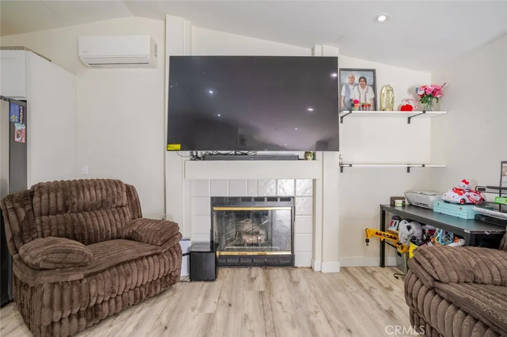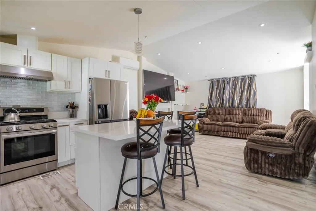 Welcome to this beautifully maintained 2 bedroom, 2 bathroom manufactured home located in Santiago Estates Community. This home features a bright open floor plan with updated finishes throughout and solar for added energy efficiency. The spacious living room flows seamlessly into the dining area and renovated kitchen, complete with white cabinetry, quartz style countertops, stainless steel appliances, and a large center island with seating. Recessed lighting and updated flooring enhance the modern feel of the home. Both bedrooms are generously sized, including a primary suite with its own private bathroom. The bathrooms have been refreshed with contemporary vanities and stylish fixtures, creating a clean and inviting atmosphere. A covered patio extends the living space and opens to a private backyard, ideal for outdoor gatherings, gardening, or relaxing. The property also offers a spacious driveway providing ample parking and convenience. The yard adds flexibility and privacy rarely found in similar homes. Conveniently located near shopping, dining, parks, and easy freeway access, this home blends comfort, functionality, and location. The community offers a gated pool, jacuzzi, private parks, and 24 hour security.