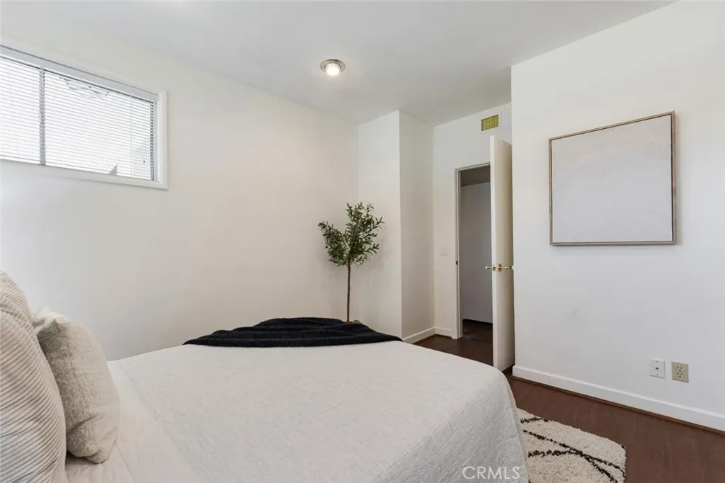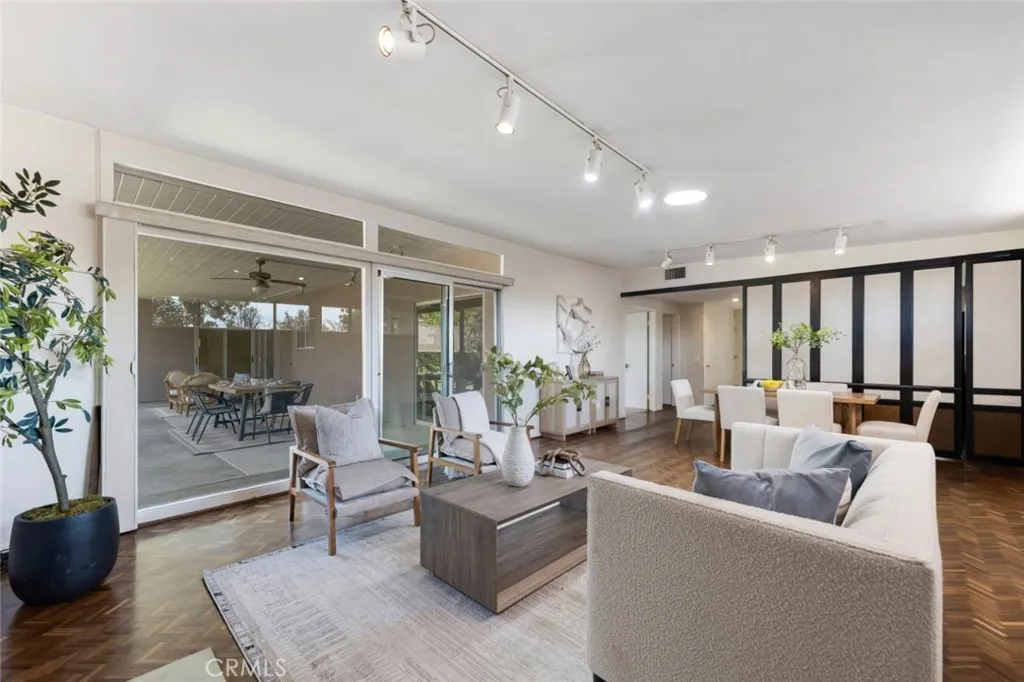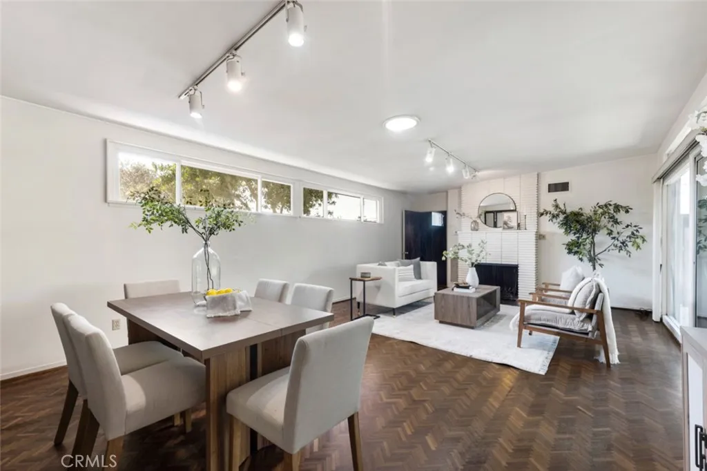 Situated on an expansive corner lot of over 11,000 sq ft, this beautifully maintained mid-century modern home offers timeless character and access to highly regarded public schools including Thomas Jefferson Elementary, John Muir Middle, & Burbank High. Manicured landscaping and a covered front porch welcome you to 2,404 sq ft home with 5 bedrooms & 2.5 bathrooms, highlighted by herringbone parquet wood flooring throughout and new carpeting in bedrooms & formal living room. The open-concept dining & family room feature a centered fireplace, abundant natural light from a floor-to-ceiling picture window, and sliding glass doors to the large covered backyard patio. A sliding wall panel reveals the galley-style kitchen with wall oven, built-in electric cooktop, a window facing the front yard, and side access to a private enclosed patio with two storage sheds. The first bedroom, just off the family room, offers an en-suite powder bath and exterior doors to both the side patio & backyard. The formal living room also enjoys natural light from two solar tubes and a sliding glass door to the backyard patio. A central hallway leads to 4 additional bedrooms and 2 updated bathrooms with travertine surrounds, mosaic tile floors, & stone countertopsone with an oversized walk-in shower, the other with a separate tub & shower with high-end hardware. One rear bedroom has a built-in dresser and sliding glass door to the backyard patio, while the adjacent bedroom has dual closets and a built-in vanityeasily convertible to a wet bar. The covered backyard patio boasts a wood ceiling with fan &
