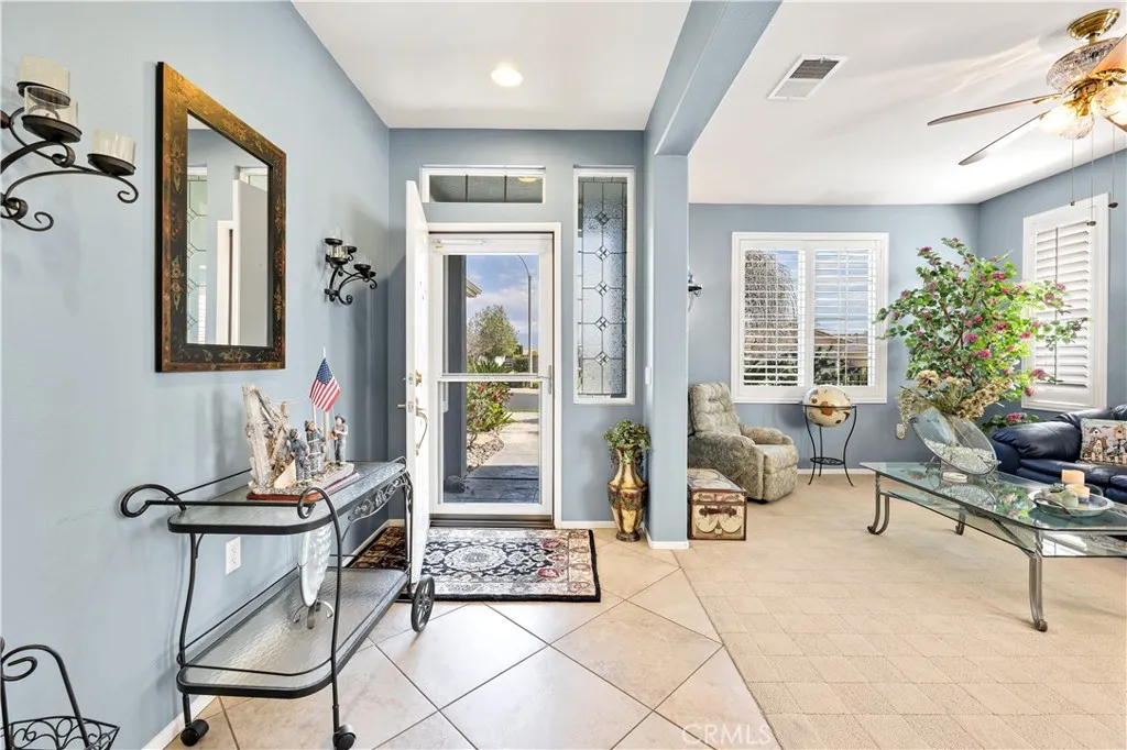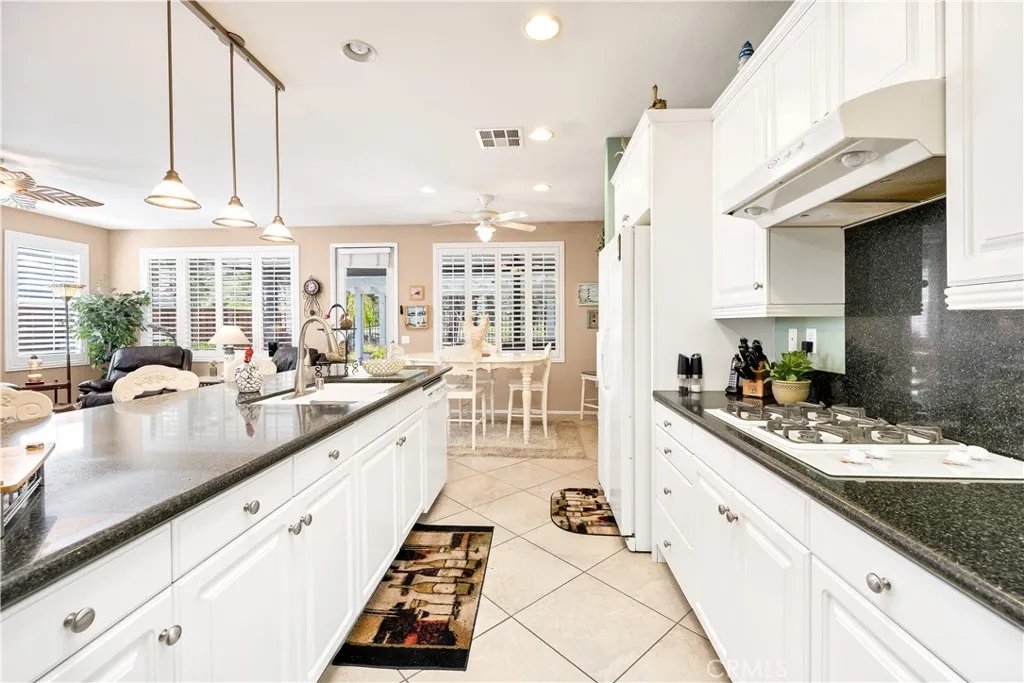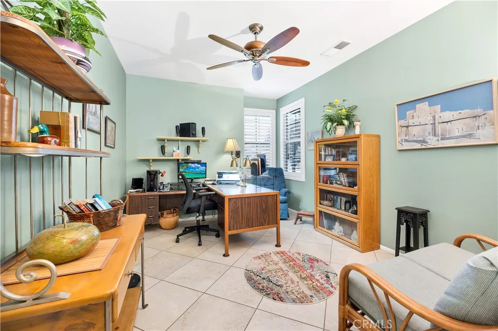 Welcome to Fabulous Guard-Gated Golf Course Community in Hemet Four Seasons! Two Bedroom home with Large office! The patio views of golf course and hills from your large full length Covered Patio is Superior! Rare 3 car garage (with room for your golf cart!), you will notice right away. Beautiful tile entry as you pass living room and dining room on your left. Next is the Family Room with built in Entertainment Center and kitchen with large island and seating; also another dining area. Multiple high end fans through-out the home. This two bedroom home also has a tastefully done office. MASTER BEDROOM HAS AN ENSUITE that can be a hobby room, private den, or Large Office! PLANTATION SHUTTERS and decorator paint through-out the home. Laundry Room boasts lots of cupboard space! Garage has lots of storage cupboards and also overhead storage racks. Much more to appreciate in this well-cared for home! FOUR SEASONS 20,000sf Lodge includes: Restaurant, Ballroom, Fitness Center, Top Notch Exercise Room, Beauty Shop, and Movie Theatre, Billiards room, Computer Center, Library, cards and crafts rooms. Outside: Half Size Olympic Pool and Spa, Shuffle board, pickle ball, Bocce ball, walking and biking, tennis, pickleball and more. All this for a LOW HOA! Temecula Wine Country nearby. 75 miles to San Diego, 80 miles to Los Angeles, 40 miles to Palm Springs Area