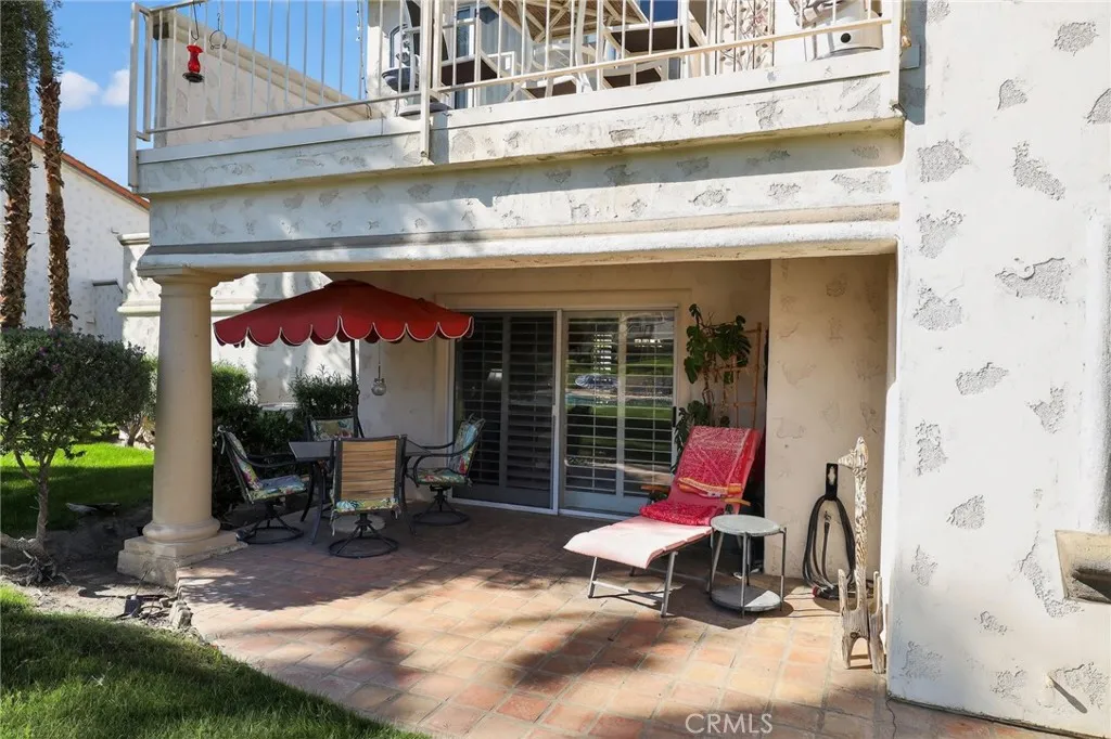 Desirable 2 bedroom, 2 bathroom ground-floor end-unit condo located in the gated community of Desert Falls Country Club. This light and bright home offers an open living space with a brick fireplace, dramatic mirror that extends to the ceiling above the mantel, and a mirror-backed wet bar, making the living room ideal for relaxing or entertaining. The dining area features a full mirrored accent wall that enhances natural light and creates a spacious feel. The kitchen includes a convenient breakfast nook for casual dining. The primary bedroom offers two large closets with sliding mirrored doors, providing ample storage. Enjoy outdoor living on the private back patio with views of the association pool, just steps away for easy access. Residents of Desert Falls Country Club can enjoy resort-style amenities such as golf, tennis courts, fitness center, clubhouse, and gated security. Conveniently located near shopping, dining, and desert recreation, this home offers the perfect blend of comfort, convenience, and country club living.