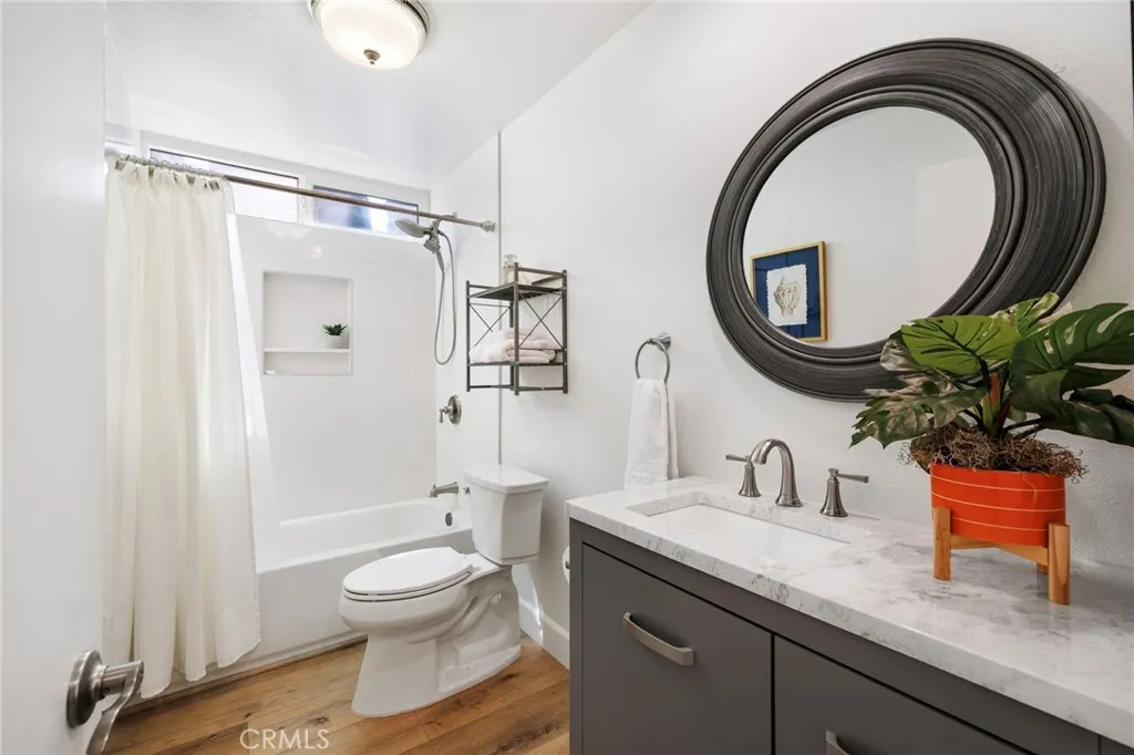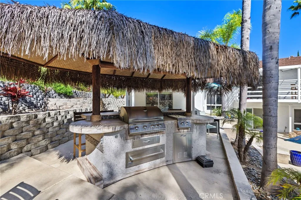 Nestled on a large lot in one of Mission Viejo's most desirable neighborhoods, this beautifully appointed 4-bedroom, 3-bath home offers a lifestyle that is hard to find and even harder to leave. From the moment you arrive, the soaring vaulted ceilings with exposed wood beams make a dramatic architectural statement that sets this home apart from anything else in the area. The sun-filled living room anchors the main level with a cozy gas fireplace, creating the kind of warm, inviting space that makes every day feel like a retreat. Throughout the entire home, luxury vinyl plank flooring and custom window coverings deliver a polished, cohesive look that feels both elevated and move-in ready. Every bathroom has been thoughtfully updated with modern finishes, and the primary bedroom features custom built-in closets designed to maximize both function and style. Upstairs, the bedrooms offer sweeping panoramic views that greet you each morning and invite you to unwind each evening. These are the kinds of views that remind you exactly why you chose Mission Viejo. Step outside and discover your own private multilevel backyard oasis, a designer outdoor living space crafted for both grand entertaining and quiet everyday enjoyment. The large sparkling pool serves as the centerpiece, surrounded by beautifully layered outdoor spaces, a built-in BBQ, and lush landscaping that provides both beauty and privacy. Tucked just off the pool is one of the home's most versatile features, a ground-level ensuite bedroom complete with a wet bar that opens directly to the outdoor living area. Whether yo