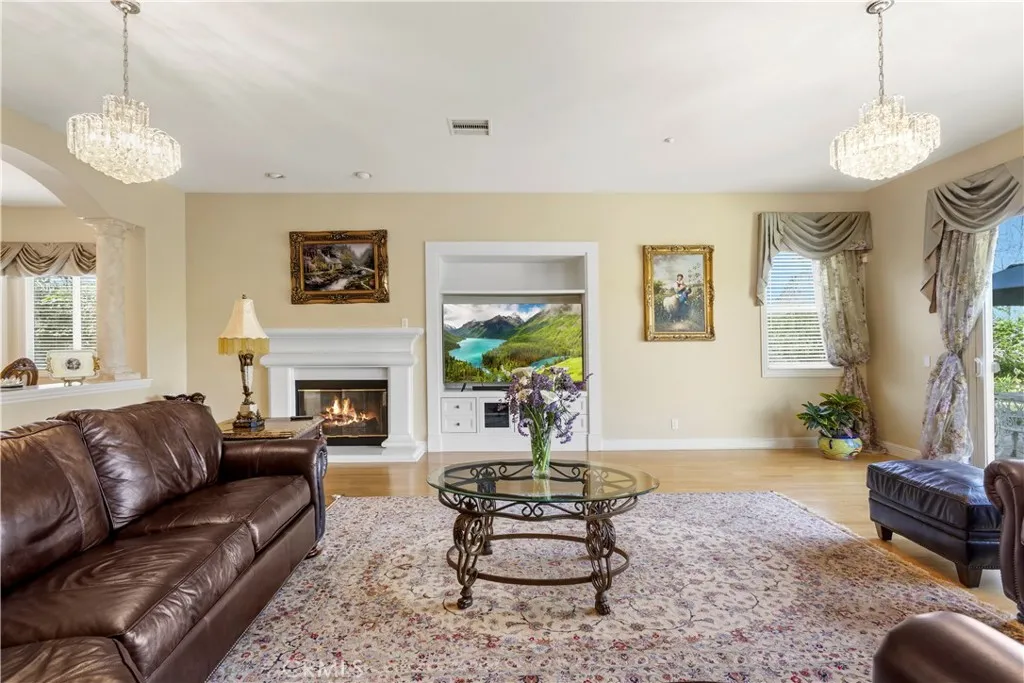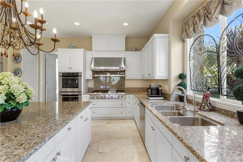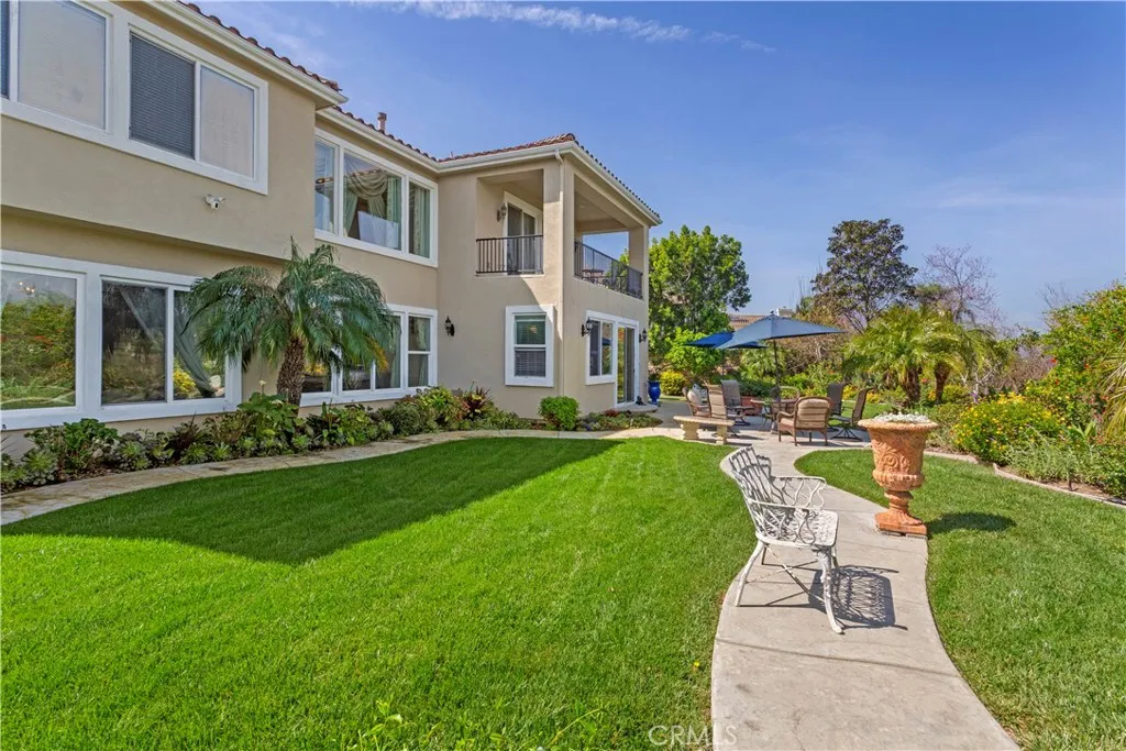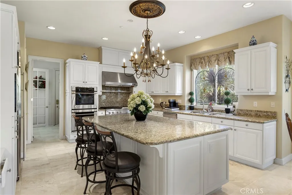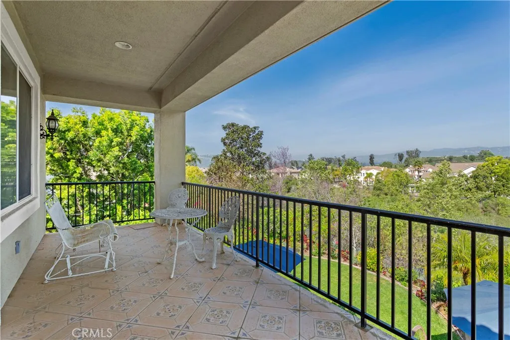 Elegant Mediterranean Luxury View Home in Pinnacle Community Experience refined living in this stunning Mediterranean luxury residence located in the highly desirable Pinnacle community. This exceptional home features breathtaking views, beautiful professional landscaping, and an impressive custom paver driveway leading to grand double entry doors with beveled glass. Inside, dramatic double wrought-iron staircases create a striking first impression. The spacious floor plan offers 5 bedrooms plus an office/library with French doors, perfect for working from home. The gourmet kitchen is designed for both everyday living and entertaining, featuring stainless steel appliances, a 6-burner stove with grill and warming drawer, upgraded cabinetry, granite countertops, a large center island, and a butlers pantry. The elegant family room features a custom fireplace, while expansive living spaces showcase custom lighting, travertine and hardwood flooring throughout. The luxurious primary suite offers a private balcony with stunning views of sunsets and city lights, along with a cozy fireplace and a convenient morning kitchen. The completely remodeled spa-inspired primary bathroom features a Jacuzzi tub, oversized shower enclosure, and dual vanities. Each bedroom includes its own attached bathroom, and a spacious downstairs bedroom provides added flexibility for guests or multi-generational living. The beautifully landscaped backyard creates a private garden retreat with numerous mature fruit trees, including persimmon, plum, peach, pear, pomegranate, apple, avocado, grapevines, fig, a