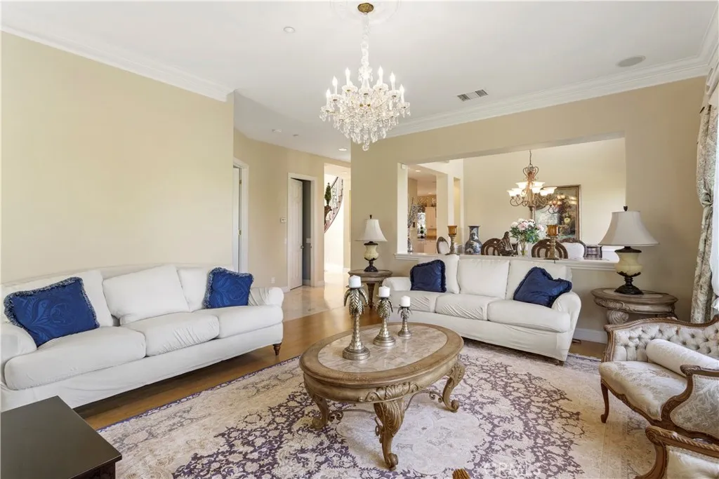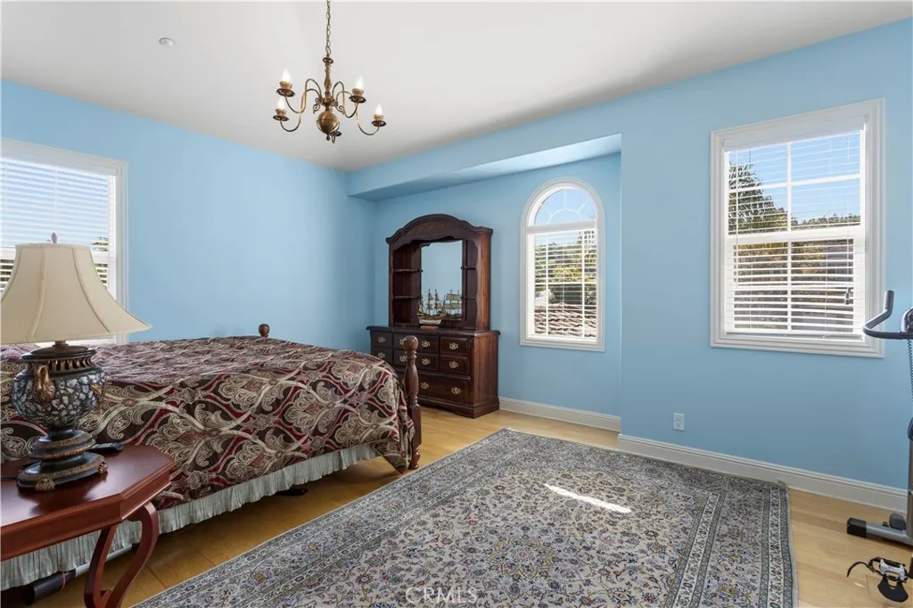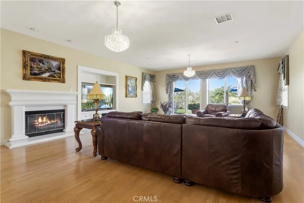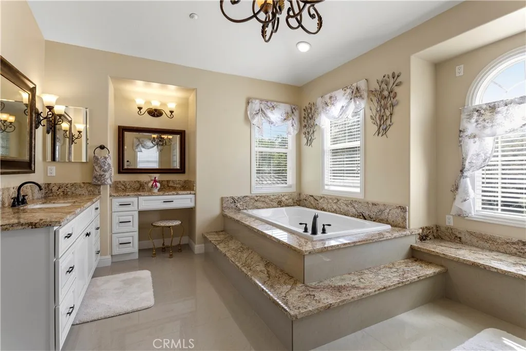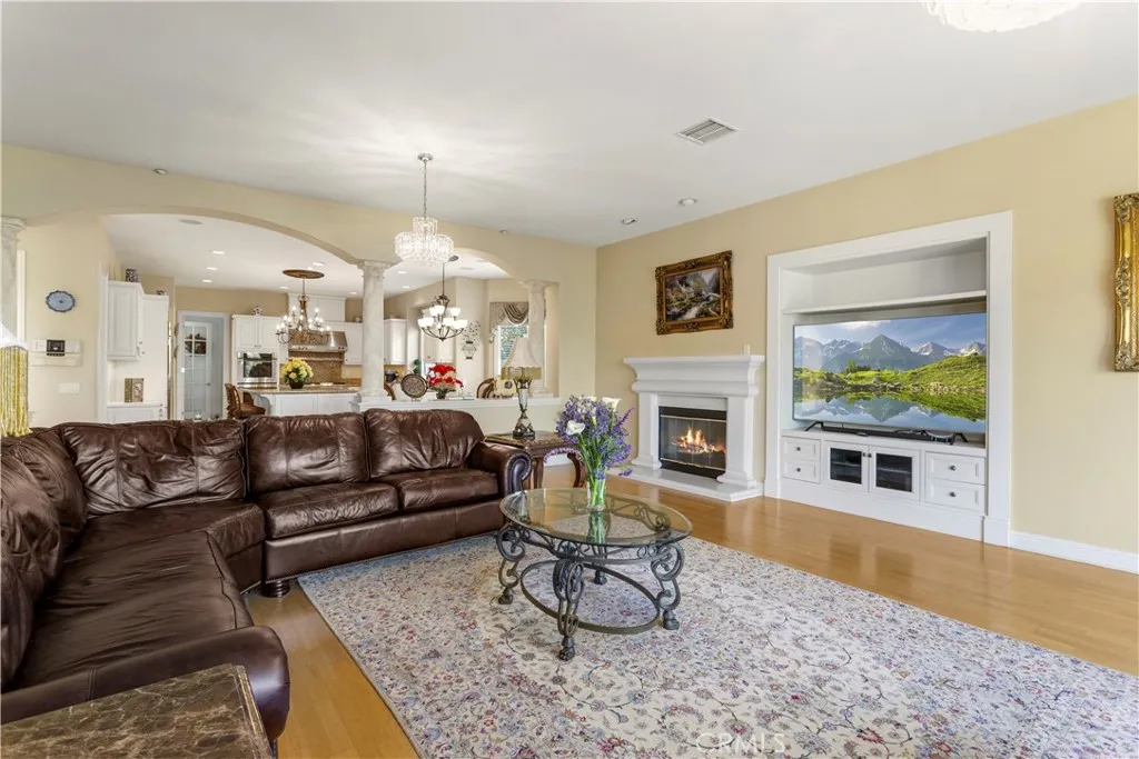 Elegant Mediterranean Luxury View Home in Pinnacle Community Experience refined living in this stunning Mediterranean luxury residence located in the highly desirable Pinnacle community. This exceptional home features breathtaking views, beautiful professional landscaping, and an impressive custom paver driveway leading to grand double entry doors with beveled glass. Inside, dramatic double wrought-iron staircases create a striking first impression. The spacious floor plan offers 5 bedrooms plus an office/library with French doors, perfect for working from home. The gourmet kitchen is designed for both everyday living and entertaining, featuring stainless steel appliances, a 6-burner stove with grill and warming drawer, upgraded cabinetry, granite countertops, a large center island, and a butlers pantry. The elegant family room features a custom fireplace, while expansive living spaces showcase custom lighting, travertine and hardwood flooring throughout. The luxurious primary suite offers a private balcony with stunning views of sunsets and city lights, along with a cozy fireplace and a convenient morning kitchen. The completely remodeled spa-inspired primary bathroom features a Jacuzzi tub, oversized shower enclosure, and dual vanities. Each bedroom includes its own attached bathroom, and a spacious downstairs bedroom provides added flexibility for guests or multi-generational living. The beautifully landscaped backyard creates a private garden retreat with numerous mature fruit trees, including persimmon, plum, peach, pear, pomegranate, apple, avocado, grapevines, fig, a