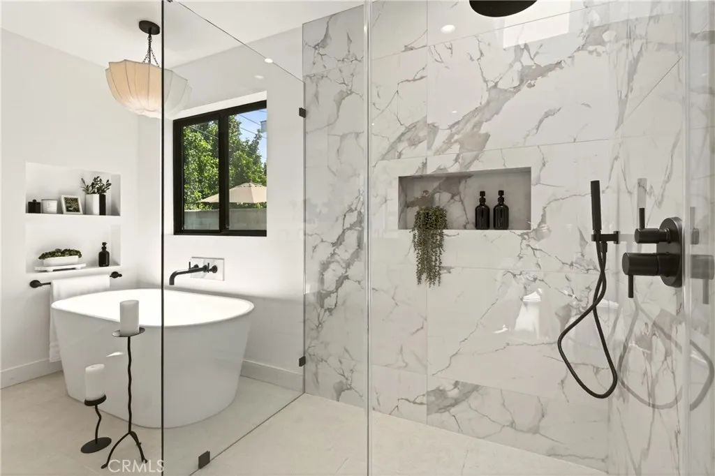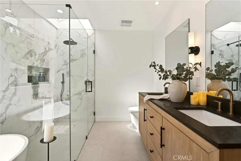 A study in modern California living, this fully reimagined Arcadia residence blends architectural intention, refined materiality, and everyday functionality into a home that lives as beautifully as it looks. Expanded with a fully permitted 920 square foot addition, the property has been thoughtfully transformed and curated by 8A Interiors, where every line, texture, and finish creates a cohesive, elevated living experience. The exterior introduces a clean, contemporary presence, smooth stucco softened by warm wood accents, framed by new landscaping, lush sod, and intentional hardscape. New Milgard windows and doors invite natural light, while updated roofing, fascia, and systems support both form and longevity. Inside, vaulted ceilings and open sight lines create a sense of volume and ease. A sculptural fireplace anchors the living space, while expansive sliding glass doors blur the boundary between indoors and out. The kitchen serves as both centerpiece and workspace, featuring clean lines, custom cabinetry, a statement island, new appliances, and elevated finishes that balance style with performance. Privately situated, the newly constructed primary suite offers a quiet retreat with a custom walk-in closet and spa-like bathroom defined by refined textures, curated lighting, and a calming palette. A complete rebuild ensures modern efficiency with new plumbing, electrical, HVAC, ductwork, and a 200-amp panel with EV capability. Wide plank flooring, layered lighting, and tailored details create a consistent design language throughout. Outdoor spaces offer a private setting w
