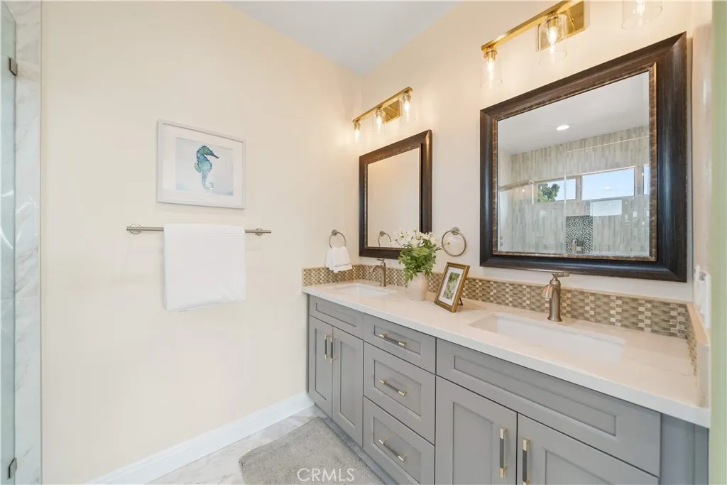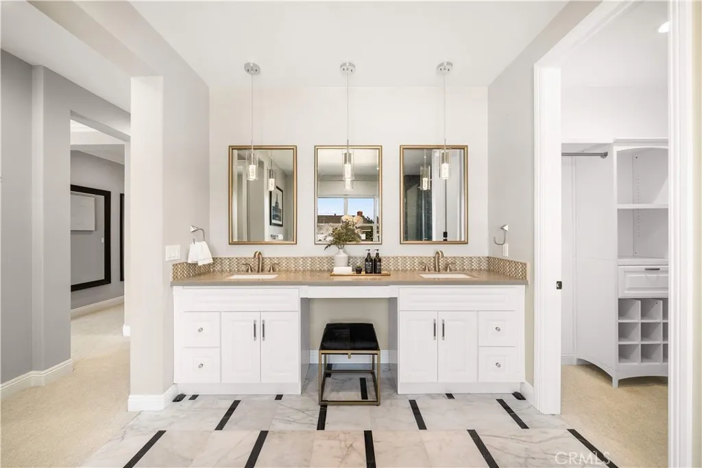 Premier Custom Residence in University Park | Rare Newer Construction in South Irvine Location Located in the highly sought-after University Park community in South Irvine, this extensively upgraded custom residence offers a rare opportunity to own a newer home in one of Irvines most established neighborhoods. Built in 2022, the home features quality craftsmanship, thoughtful design, and refined finishes throughout. A well-designed floor plan welcomes you inside. The main level includes two en-suite bedrooms with private entrancesideal for multi-generational living or guestsalong with a dedicated office and powder room. Interior highlights include a curved wrought-iron staircase, designer chandelier, and hardwood flooring throughout the first floor. The open-concept great room features expansive sliding glass doors that seamlessly connect indoor and outdoor living. The gourmet kitchen is equipped with glass display cabinetry, KitchenAid appliances, an oversized Sub-Zero built-in refrigerator, marble countertops, and a walk-in pantry. The dining area is surrounded by sliding glass doors and complemented by a wine refrigerator and storage. Upstairs, a spacious loft connects to a custom home theater, creating a flexible entertainment space. Four en-suite bedrooms are well-separated for privacy, including two primary suites: The primary suite 1 features double-door entry, dual vanities, a soaking tub, huge walk-in shower, and his-and-her walk-in closets with marble flooring. The primary suite 2 offers a private balcony and a multi-head shower for a spa-like experience.Two addit