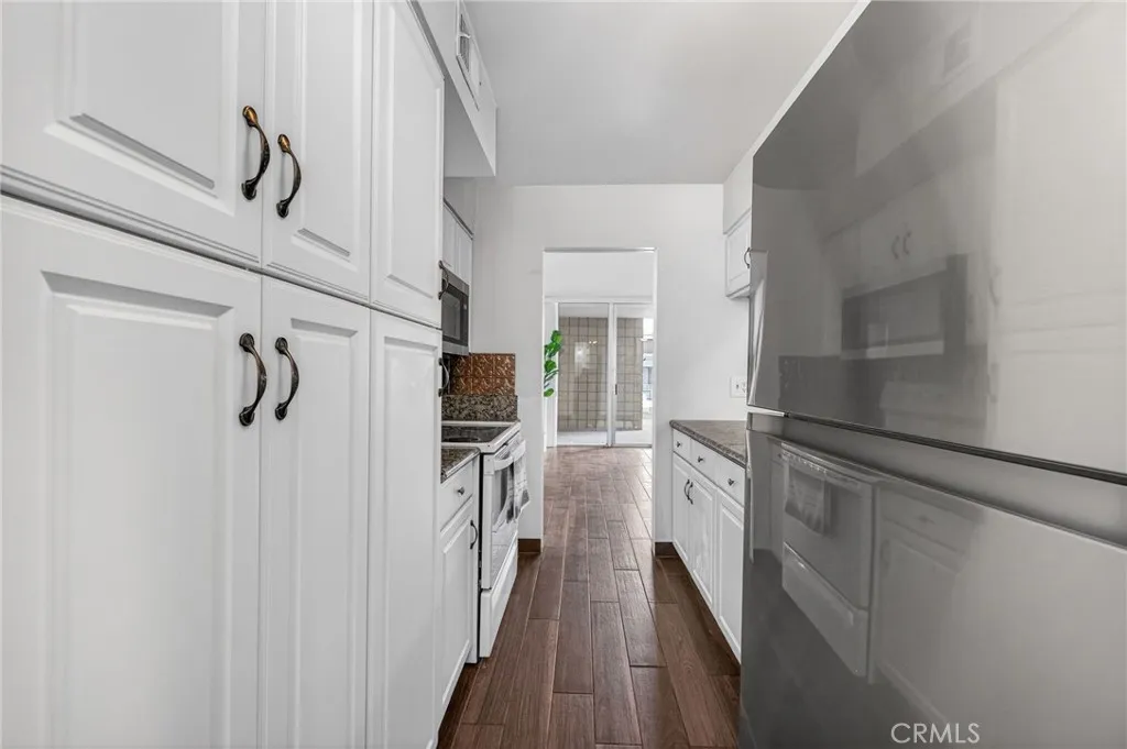 Welcome to Magnolia Palms, where first-floor living and a practical floor plan come together in a gated Riverside community. This 2-bedroom, 1-bath condominium offers a spacious living and dining area with wood-look flooring and large sliding glass doors leading to a covered patio with courtyard outlooks. The galley kitchen provides ample cabinetry, generous counter space, and a breakfast bar/pass-through that keeps the layout open to the main living area. Both bedrooms are well-proportioned and offer flexibility for everyday living, guest accommodations, or office use. Interior features also include ceiling fans, substantial storage, and a bathroom with built-in cabinetry and distinctive vanity design. Community amenities include pool and spa, with convenient access to nearby shopping, dining, and commuter routes.
